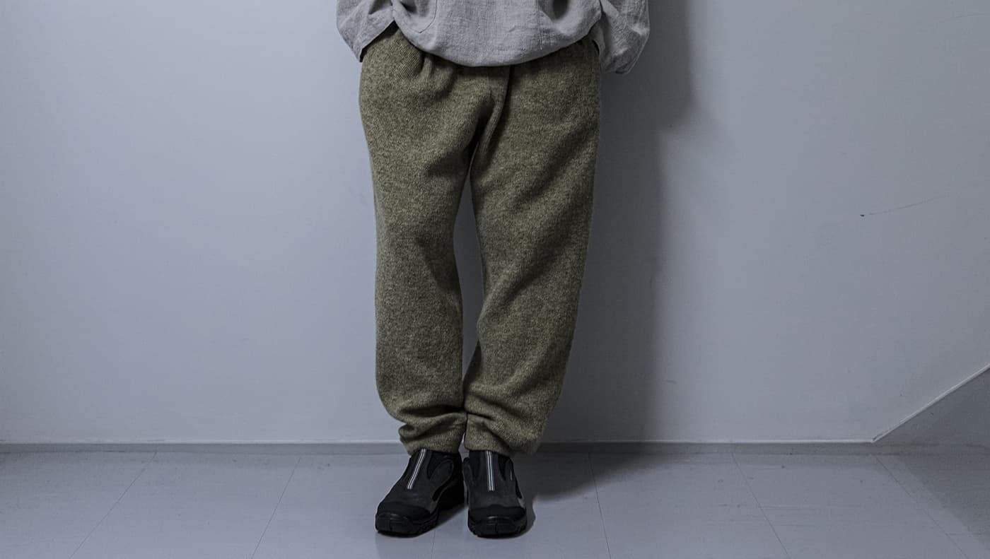 24AW期は国内生地メーカーと協業し、ウールとコットンを組み合わせたクォーターゲージファブリックを別注生産。この生地を使用して、ラグランスリーブプルオーバーとイージーパンツの2型をリリースしました。