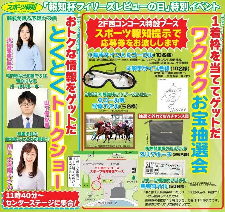 トークショーではスポーツ報知の水納愛美記者、山下優記者が出演。競馬リポーター・大恵陽子さんの司会でレースを展望します。また、騎手のサイン入りゴーグルや当日の報知杯フィリーズレビューのゴール前写真パネルなどが当たる「お宝抽選会」を実施。2階西コンコースのスポーツ報知特設ブースに当日の本紙を持参した方に応募券をお渡ししますので、1着になる枠を予想してご応募ください。たくさんの方のご参加をお待ちしています。
