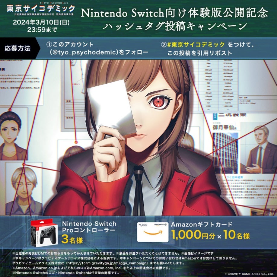 本日より、『東京サイコデミック』公式Xアカウントにて、Nintendo Switch向け体験版公開を記念したキャンペーンを開催いたします。Xアカウントにて投稿中のキャンペーンポストより参加方法をご確認の上、ご応募いただいた方の中から抽選で、豪華景品をプレゼントいたします。