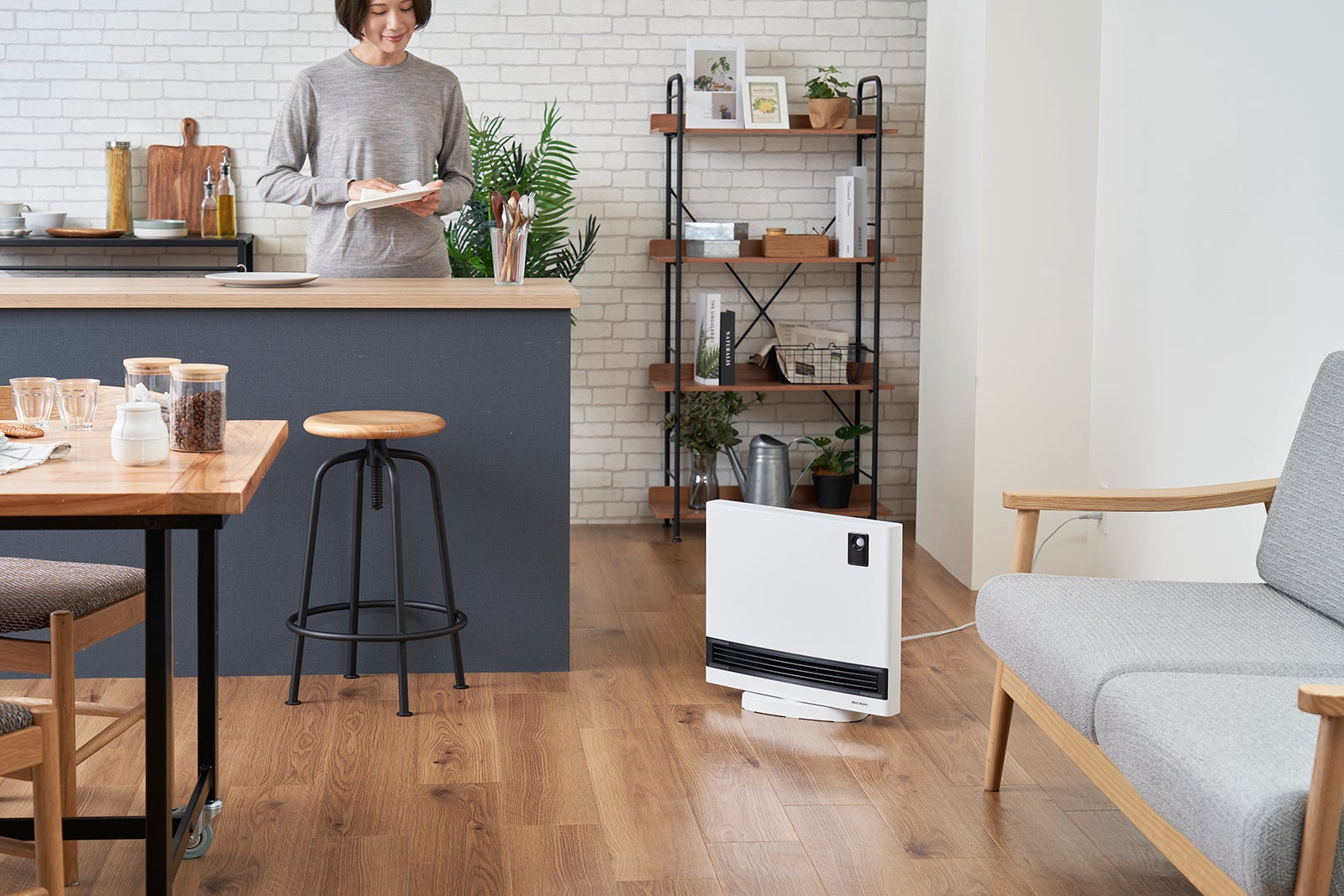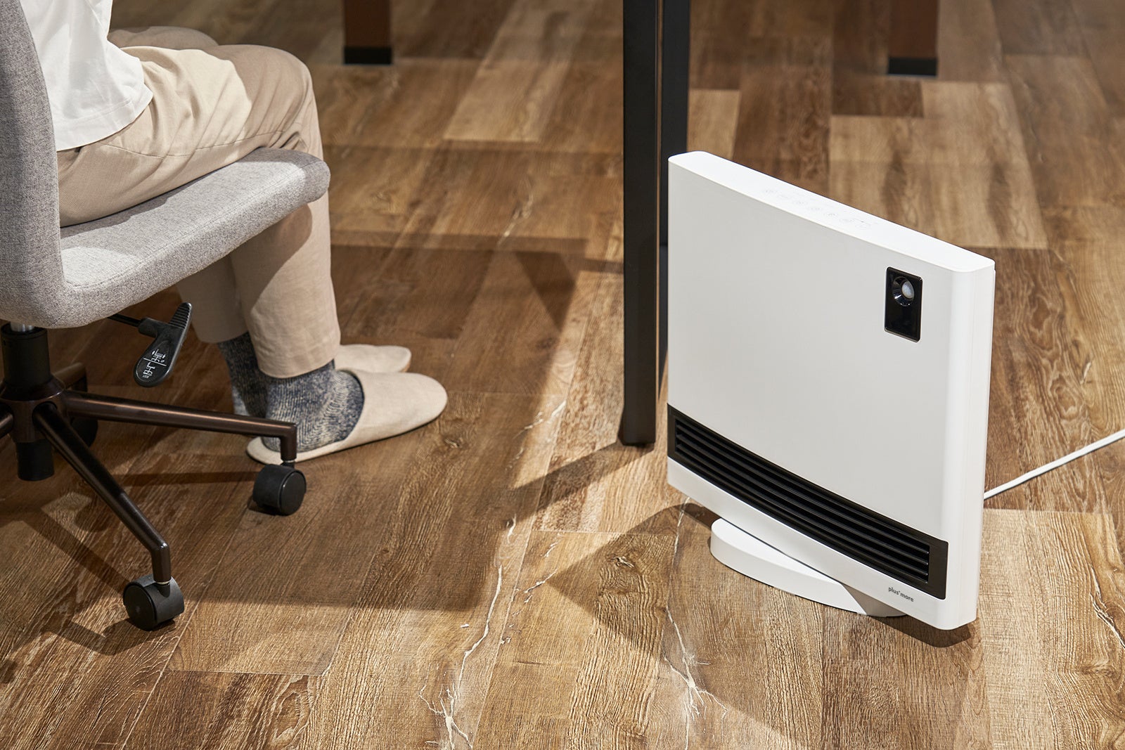 1200Wのハイパワーで出力する温風と、左右首振り×上下に動く自動ルーバー機能で、冷え切った広い部屋も素早く速暖。ヒーターに内蔵した人感センサーとオート機能が、無駄な運転を防ぎ省エネ化を実現。