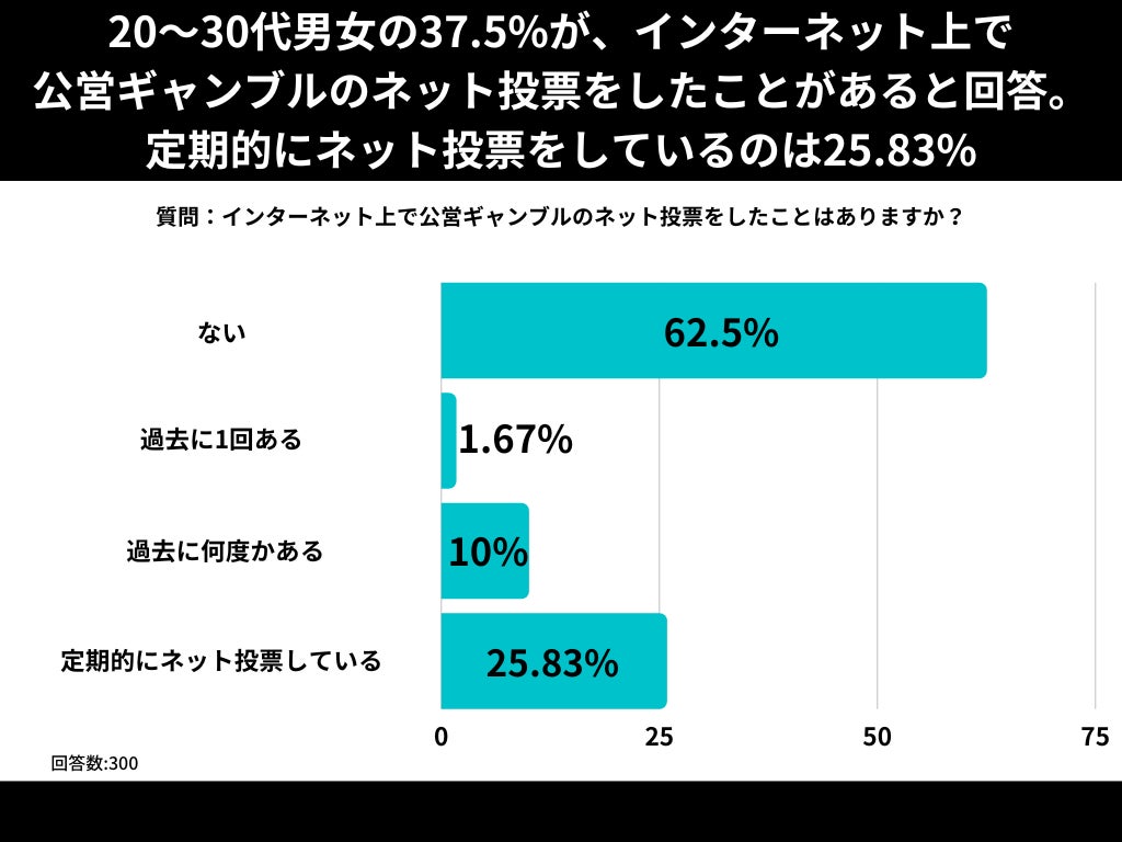 20~30代男女の37.5%が、インターネット上で公営ギャンブルのネット投票をしたことがあると回答。定期的にネット投票をしているのは25.83%【公営ギャンブルのネット投票に関するアンケート】