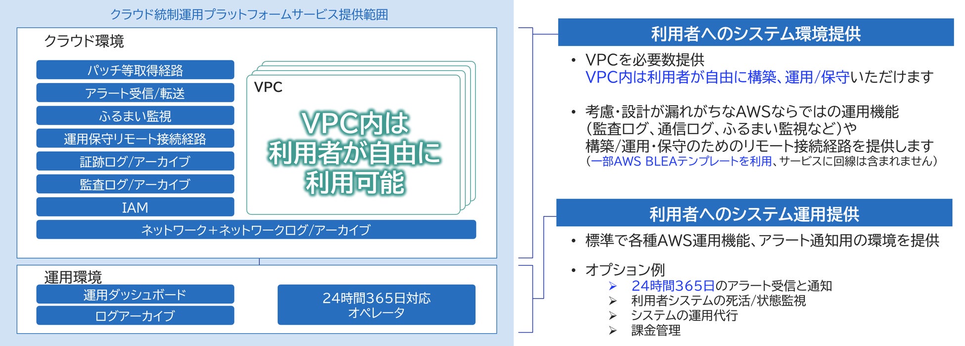 本サービスではアマゾン ウェブ サービス(以下AWS)が標準提供するサービスを利用した、AWS環境のセキュリティベストプラクティステンプレート「BLEA(読み:ブレア、Baseline Environment on AWS)」を活用して基本的なセキュリティを担保するとともに、NECが持つ行政機関向けのクラウド基盤運用ノウハウを組み合わせた環境を提供します。