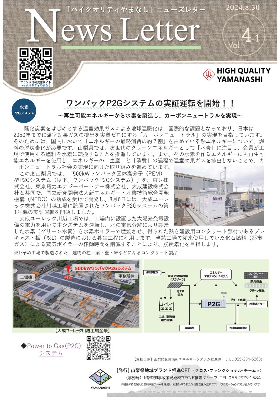山梨県(知事:長崎幸太郎)では、本県にある様々な魅力、本県が目指す次世代社会への取り組みを紹介すべく、山梨=「先進的」・「挑戦を支援」などといったイメージを徹底して訴求し、本県が目指す未来像や各施策の露出拡大、ブランドの認知・浸透につなげるため、地域ブランド推進CFT(注1)「イノベーション(先進・次世代)チーム」として「ハイクオリティやまなしニューズレター」を、ブランド情報発信サイト「ハイクオリティやまなし」にて公開しています。