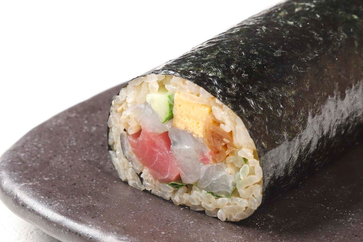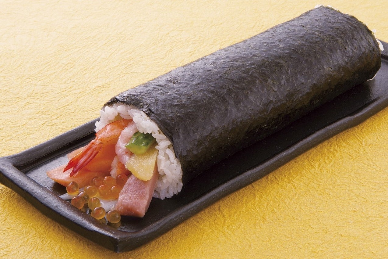 生本まぐろ、生アトランティックサーモン、真鯛、えび、いか、いくら、かに、玉子焼きなどが入った豪華な海鮮恵方巻きです。海鮮の旨味がぎっしり詰まっていて、海鮮好きにはたまらない一品です。