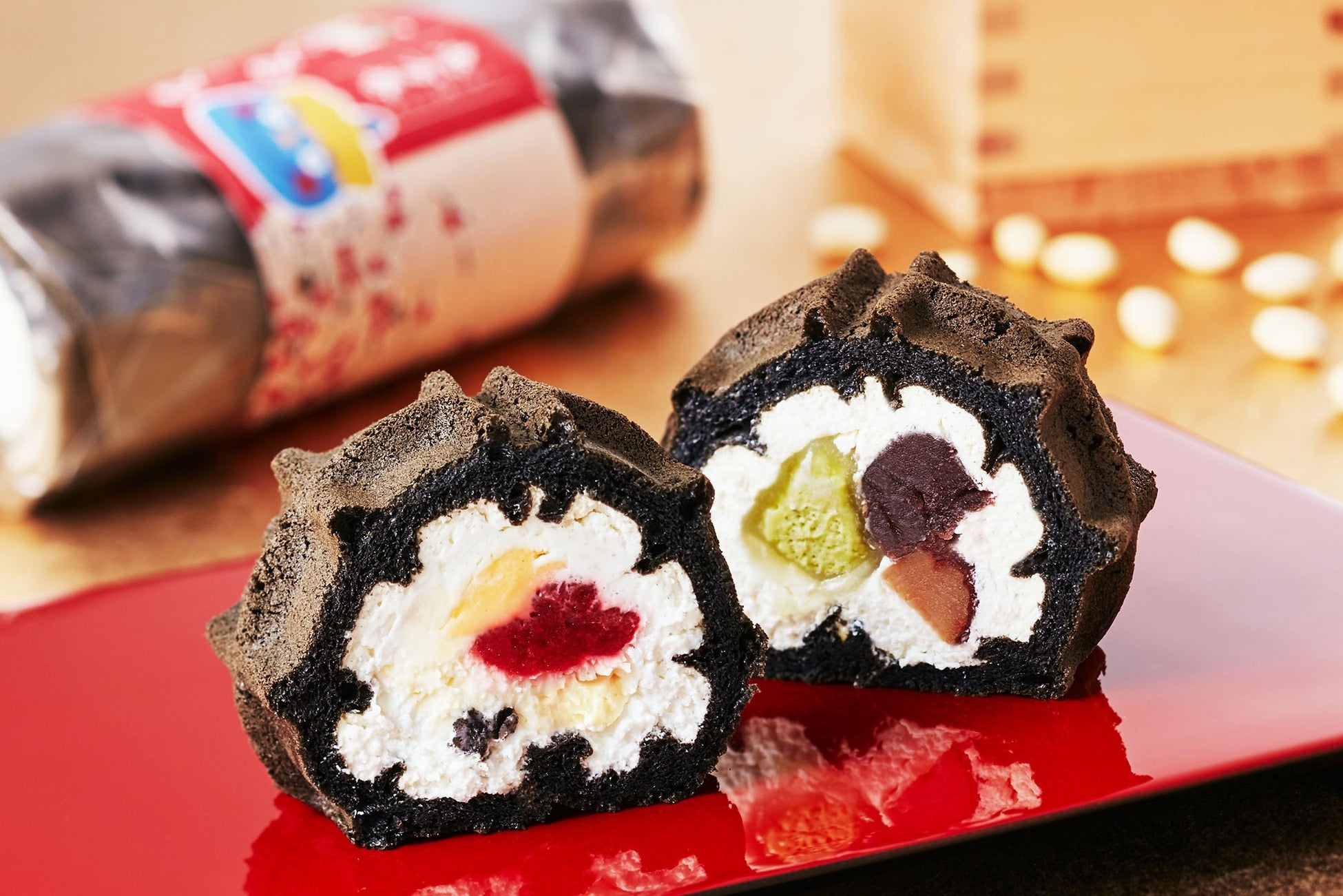 恵方巻に使われる7つの具材をクリームや粒あん、求肥や渋皮栗などで表現。1本で2倍のおいしさが楽しめるよう、半分ずつに異なる具材をロールしました。
