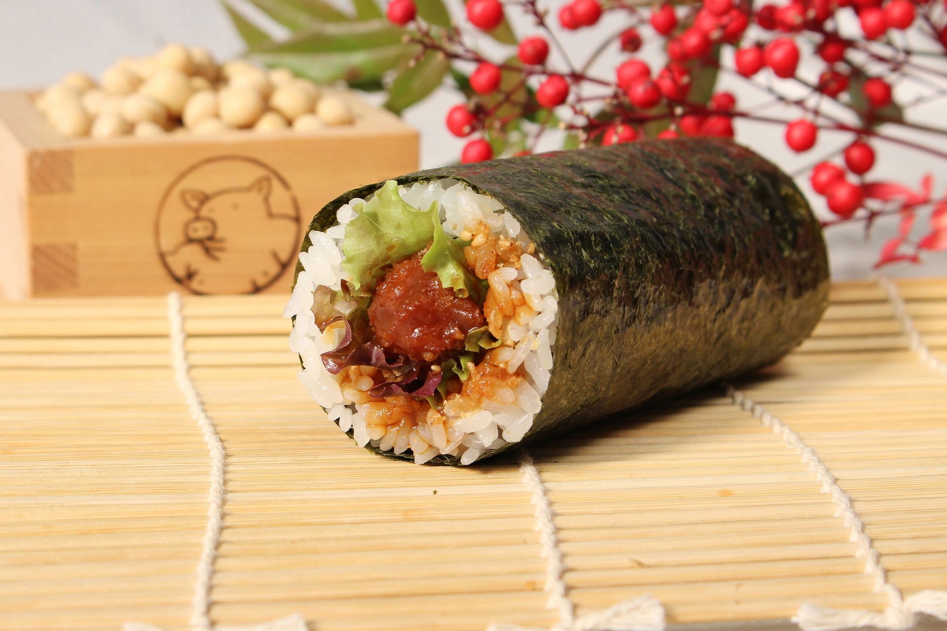 みそだれをたっぷり付けた、ひれとんかつを巻いたみそかつの恵方巻きです。みそ&マヨネーズのまろやかさにあわせて、ガリ&ゴマがさっぱりとして食べやすいです。南九州産のお肉を使用していて、柔らかい肉質です。使用している海苔は祈祷済みで、運気アップできそう!