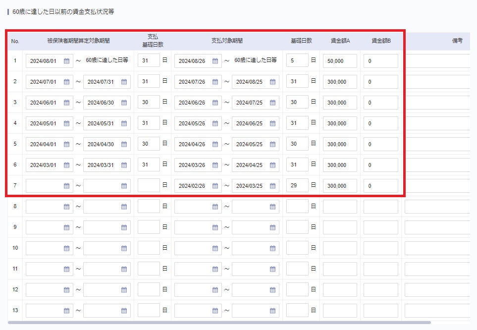 高年齢雇用継続給付支給申請書の賃金額を算出する際に、被保険者期間算定対象期間、支払基礎日数、支払対象期間、基礎日数、賃金額A、賃金額Bに対して、定められたルール通りに値を入力する必要があります。