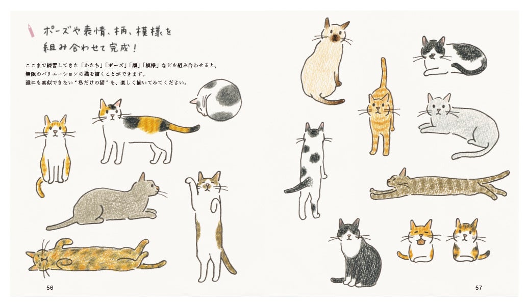 基本的な画材などの説明にはじまり、猫の顔や体、模様の特徴、猫ならではのポーズのバリエーション、豊かな表情や個性的な顔立ちなど、猫好きならではのコツが満載。また、「色ははみ出すくらいラフでOK」「ガタガタの線も味になる」など、つい気にしがちなポイントをポジティブな言葉で応援してくれるから、失敗を恐れずに楽しみながら猫を描くことができます。