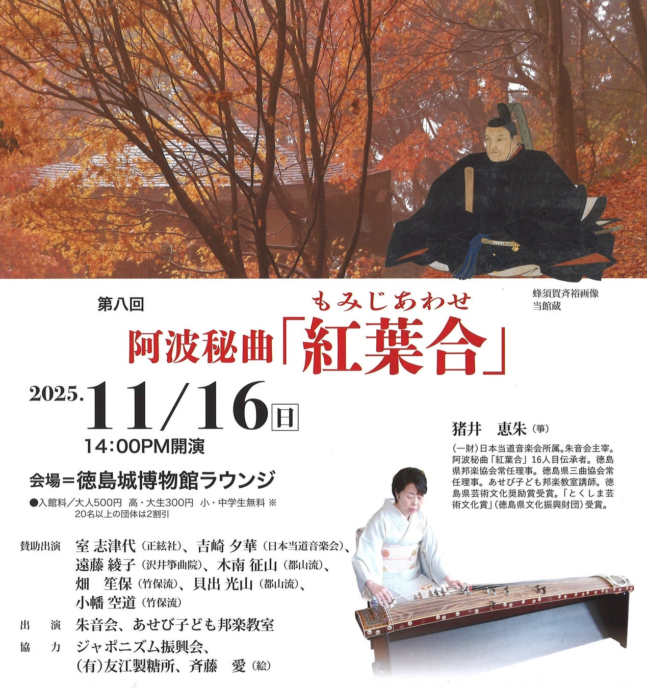 蜂須賀家ゆかりの筝曲「紅葉合」の演奏を中心とした、邦楽の演奏をお楽しみください。