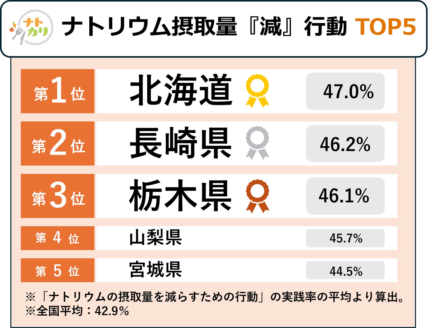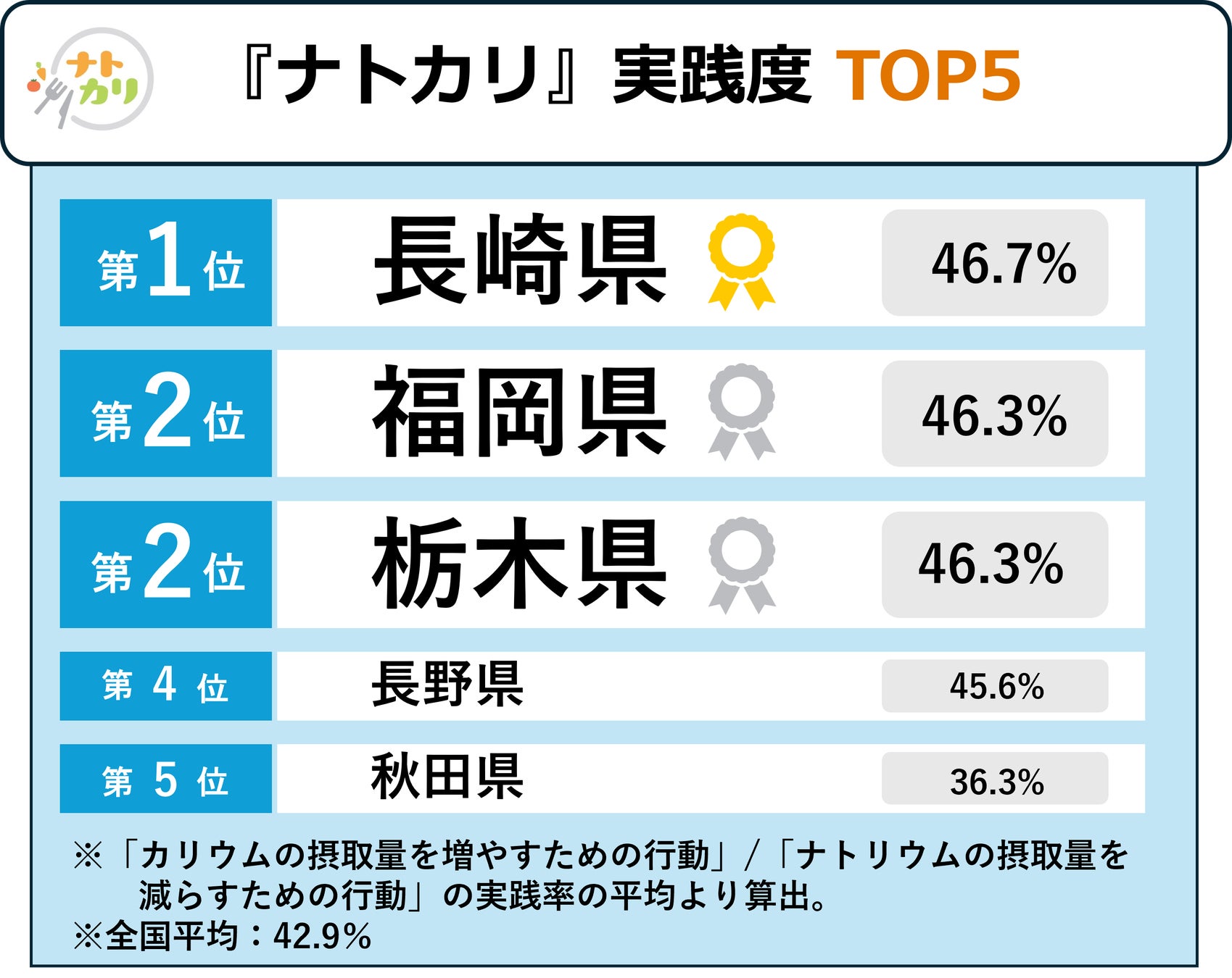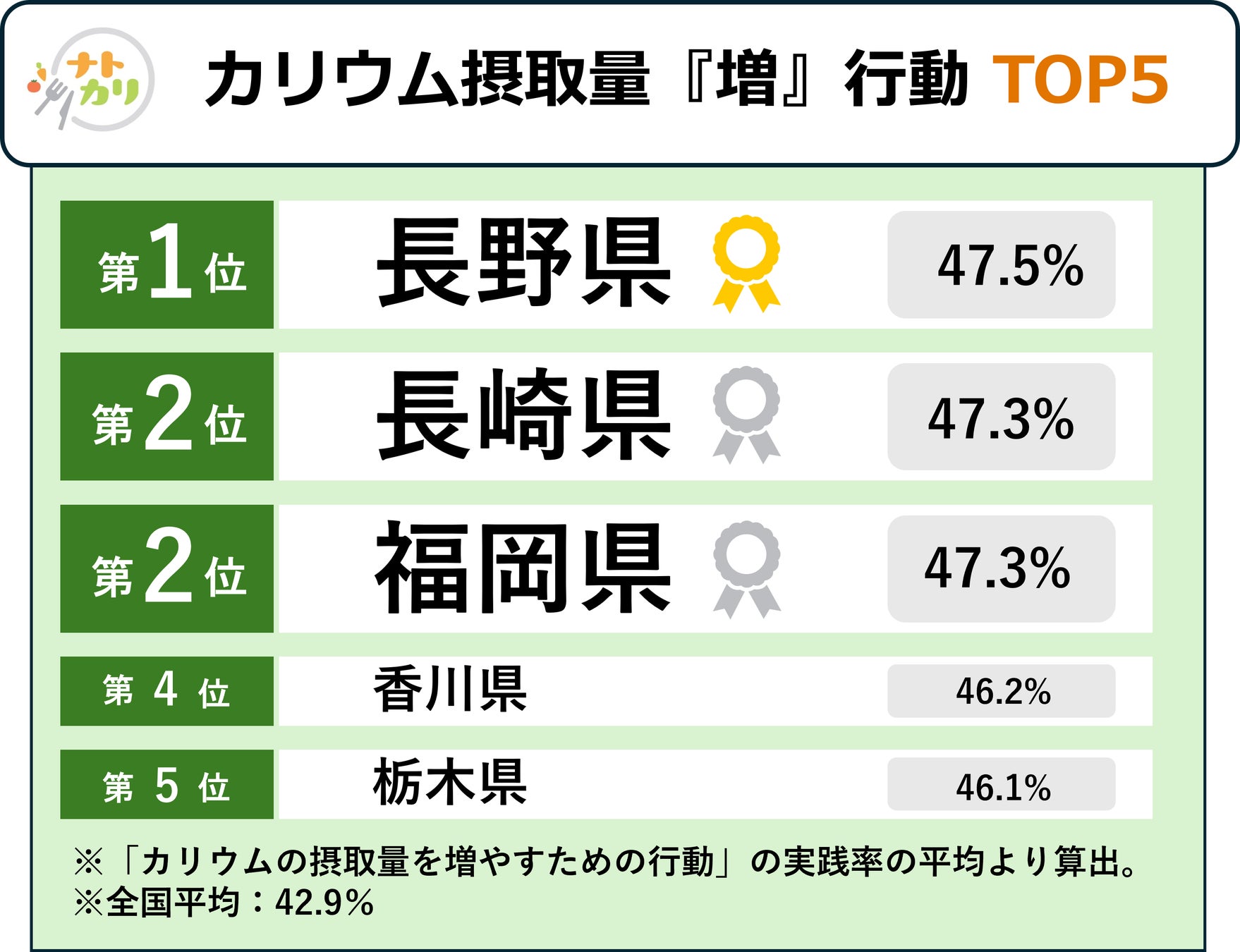 合わせて、「ナトカリ行動」(ナトリウムを減らす行動及びカリウムを増やす行動)の各項目のスコア平均を47都道府県で比較したところ、「ナトリウムの摂取量を減らすための行動」の場合1位は「北海道」、「カリウムを増やすための行動」の1位は「長野県」、という結果となりました。さらに、総合結果として、最も「ナトカリ行動」を実践できている県民の割合が多いのは「長崎県」であり、「ナトカリ」を意識していることで、しっかり行動もできていることが分かりました。