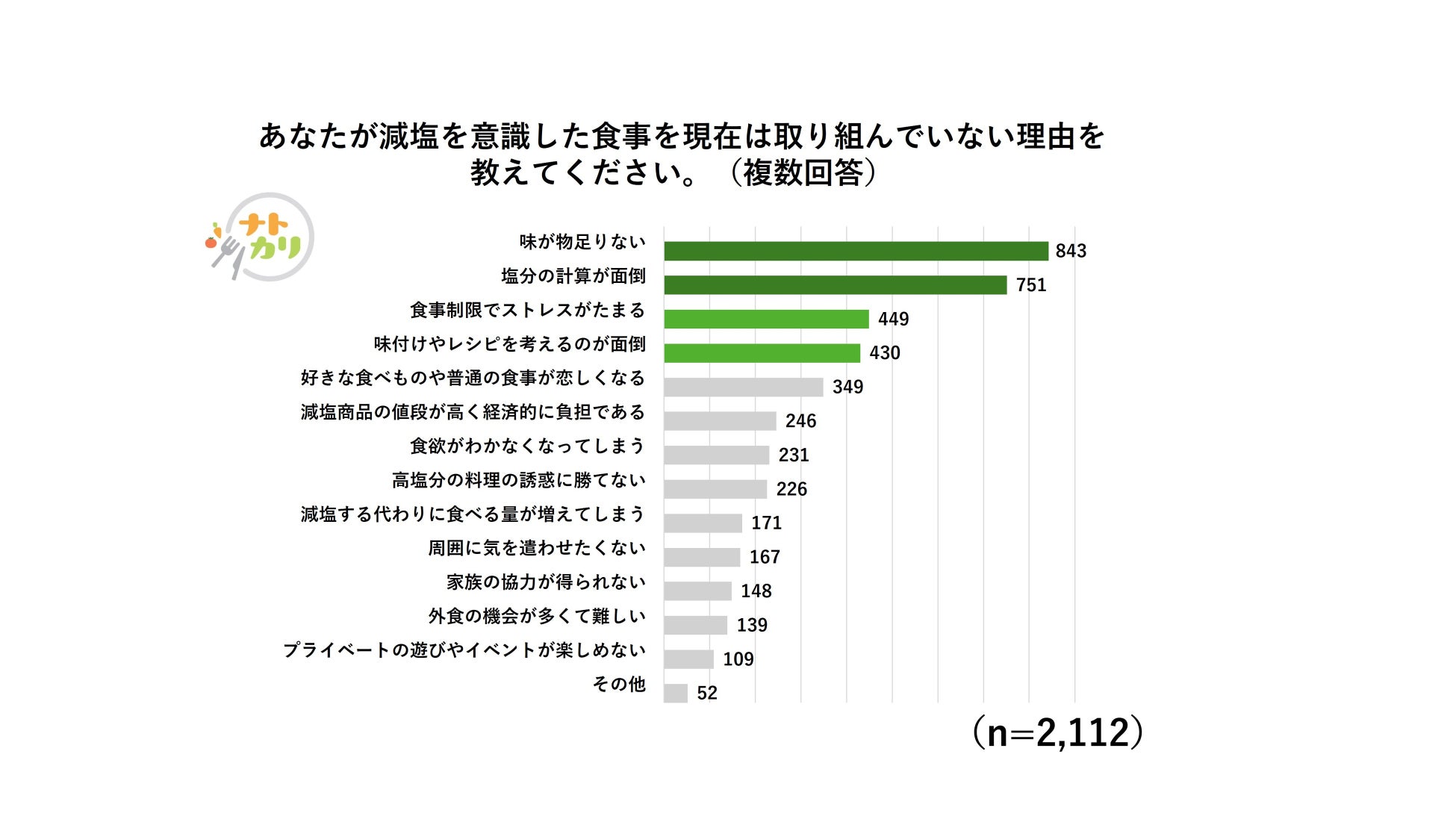 現在、減塩を意識した食事に取り組んでいない人にその理由を複数回答で尋ねたところ、上位には「味が物足りない」「塩分の計算が面倒」「食事制限でストレスがたまる」「味付けやレシピを考えるのが面倒」といった回答が挙がりました。