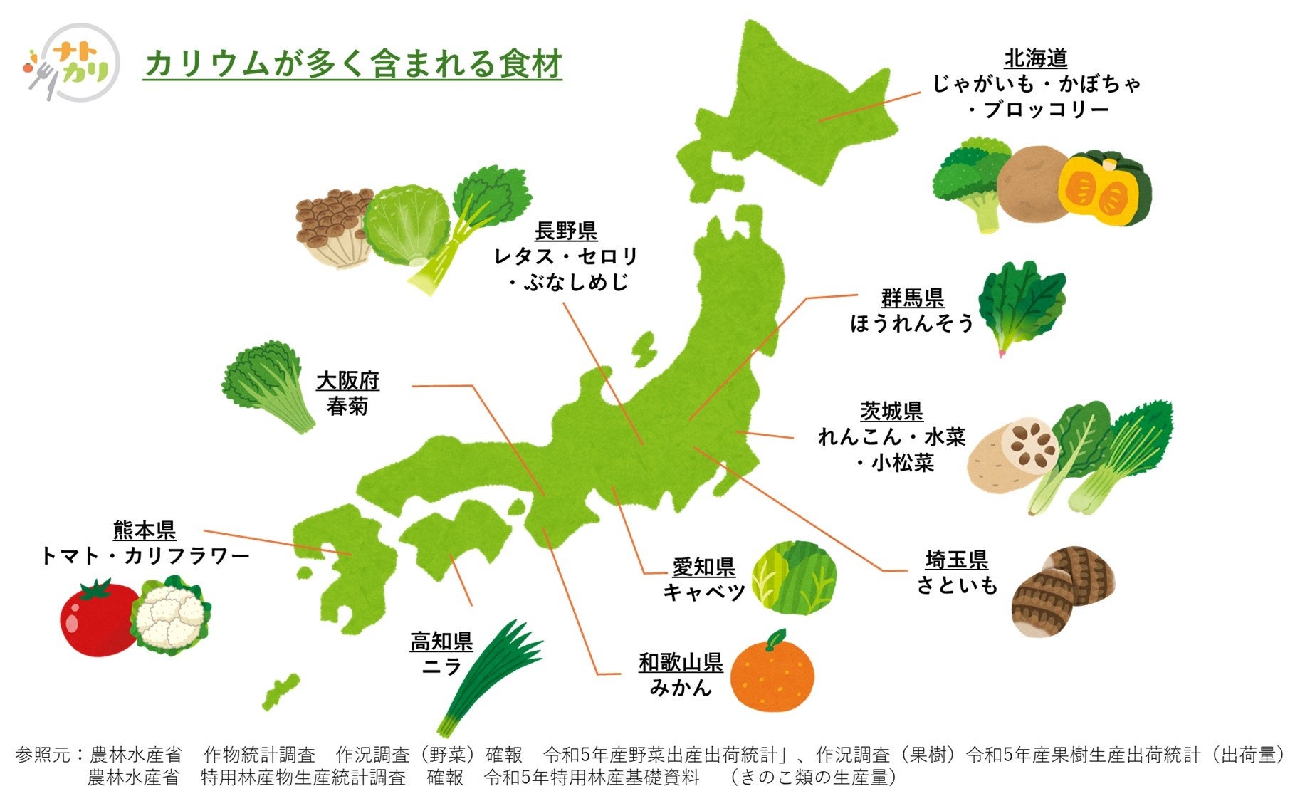 カリウムを豊富に含む食材について、出荷量第一位の県別にご紹介します。これらの食材の中には、郷土料理に使われるなど地域に根付いたものや、地元の人々に親しまれている食材も多く、お住まいの地域でよく作られている食材を知ることで、日々の食生活にも取り入れやすく、無理なくカリウム摂取の工夫をするヒントにもつながります。