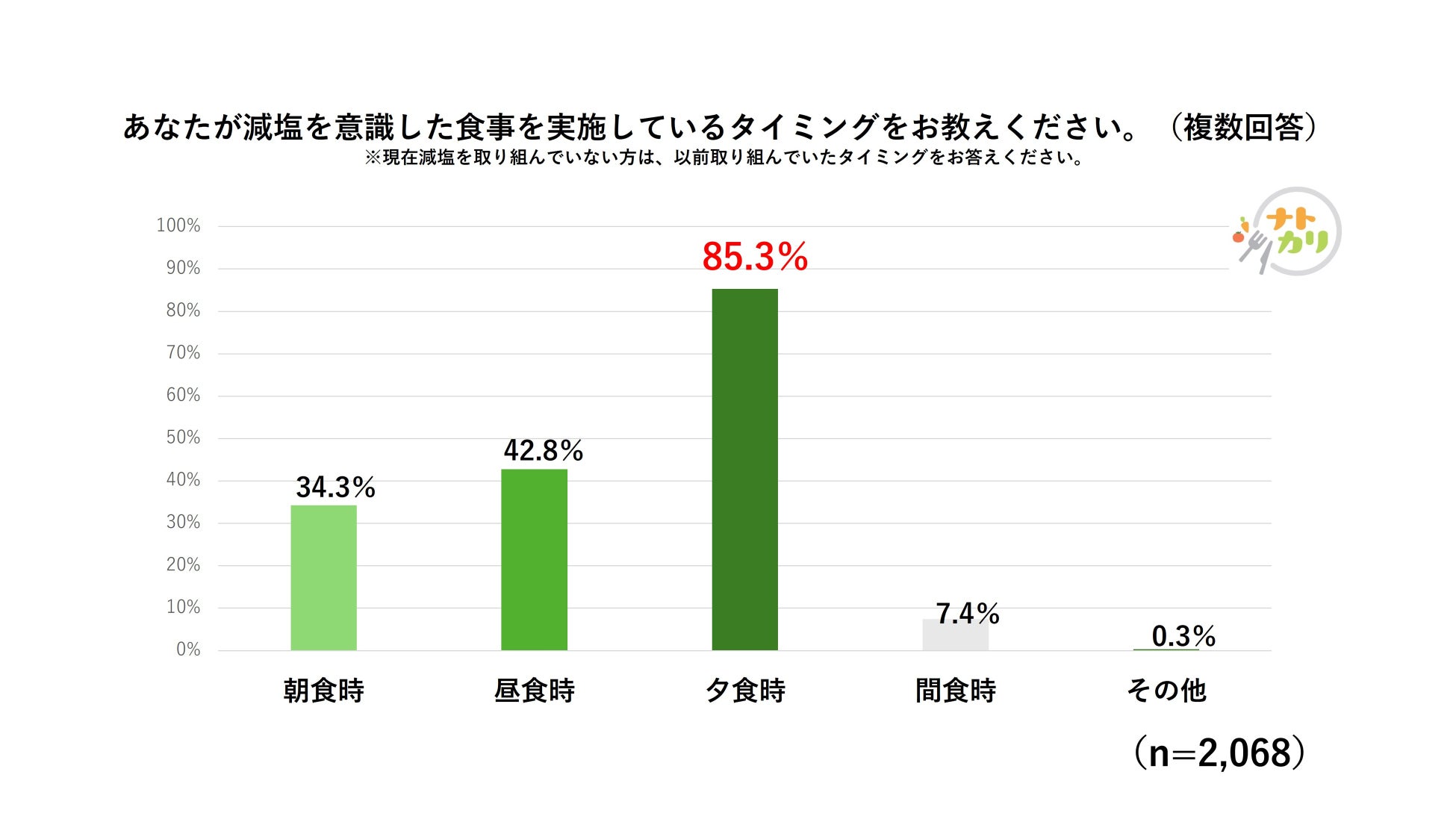 減塩の取組経験のある方2,068人に減塩を意識した食事を実施している(していた)タイミングを尋ねたところ、 「夕食時」が最も多く、朝・昼・夕の3食の中では、朝食時が最も少ない結果になりました。