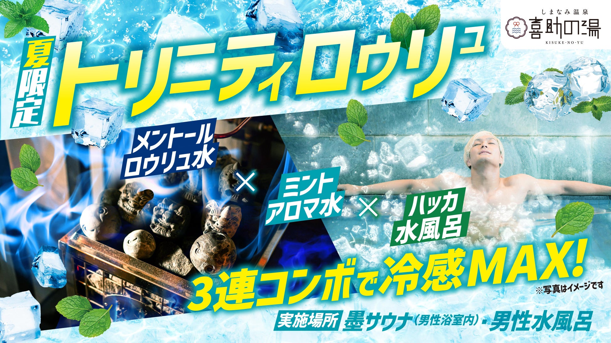 総合エンターテイメント企業・キスケ株式会社(本社:愛媛県松山市、代表:山路義則)が運営する「伊予の湯治場 喜助の湯」「しまなみ温泉 喜助の湯」では、2025年7月・8月の毎週金曜日限定で、夏の特別企画『トリニティロウリュ』を開催いたします。メントール・ミント・ハッカの3つの冷感要素を組み合わせた“冷却トリプルアタック”で、暑い季節のサウナタイムを爽快に演出します。