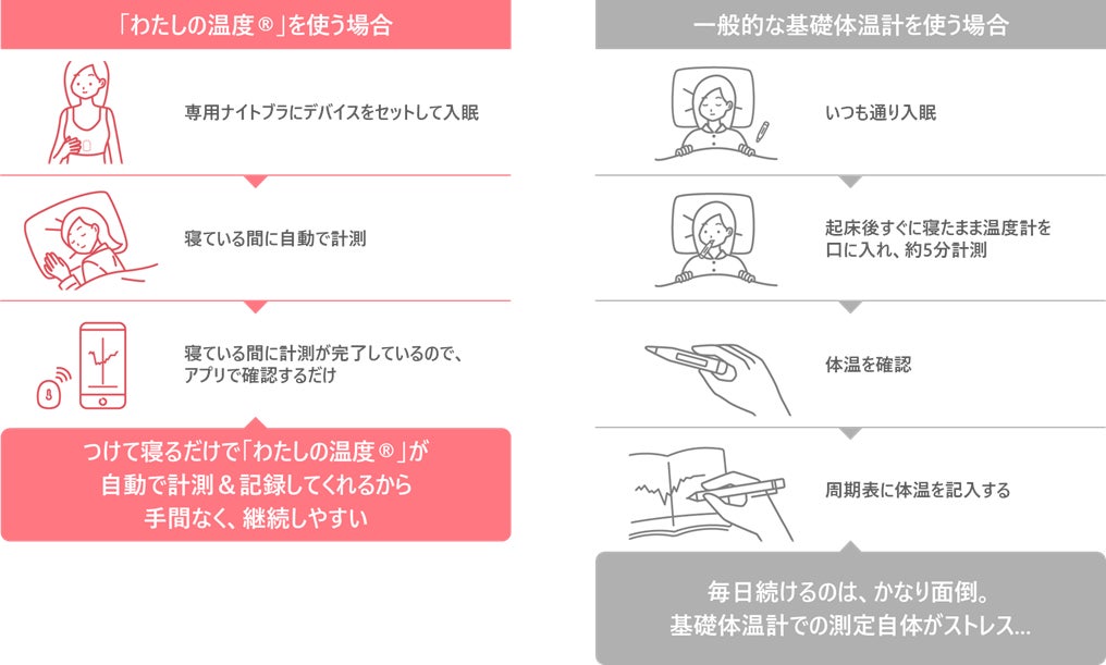 就寝前に専用ナイトブラに装着して寝るだけで、女性特有の温度リズムを自動で計測し、記録することができる デバイスです。毎朝決まった時間に基礎体温を計測し、記録する一般的な基礎体温の管理方法に対し、本デバイスは専用アプリと連携し、寝ている間に自動で計測と記録が完了するため、手間なく、計測を続けることができます。