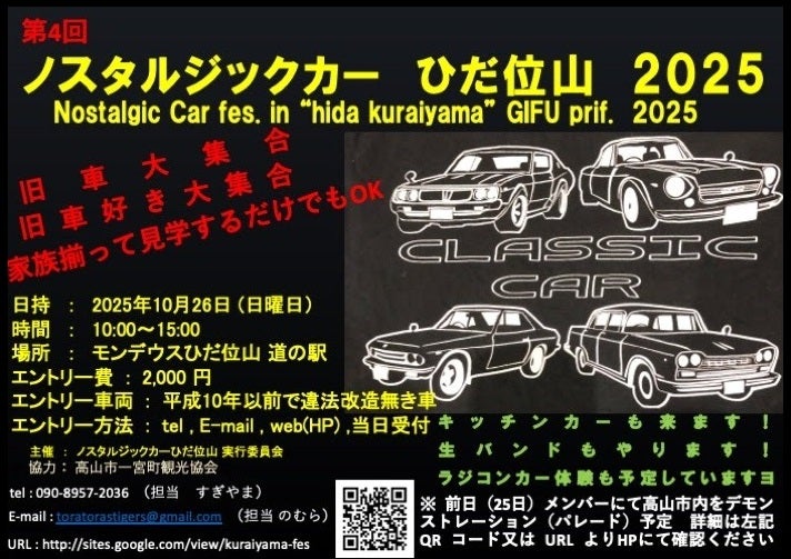 令和7年10月26日(日)、岐阜県高山市の道の駅「モンデウス飛騨位山」にて「ノスタルジックカーひだ位山2025」を開催します。第3回の昨年は、約120台の旧車がエントリーし、来場者も2,300人以上と大盛況だった「ノスタルジックカーひだ位山」、今年も熱く開催します!