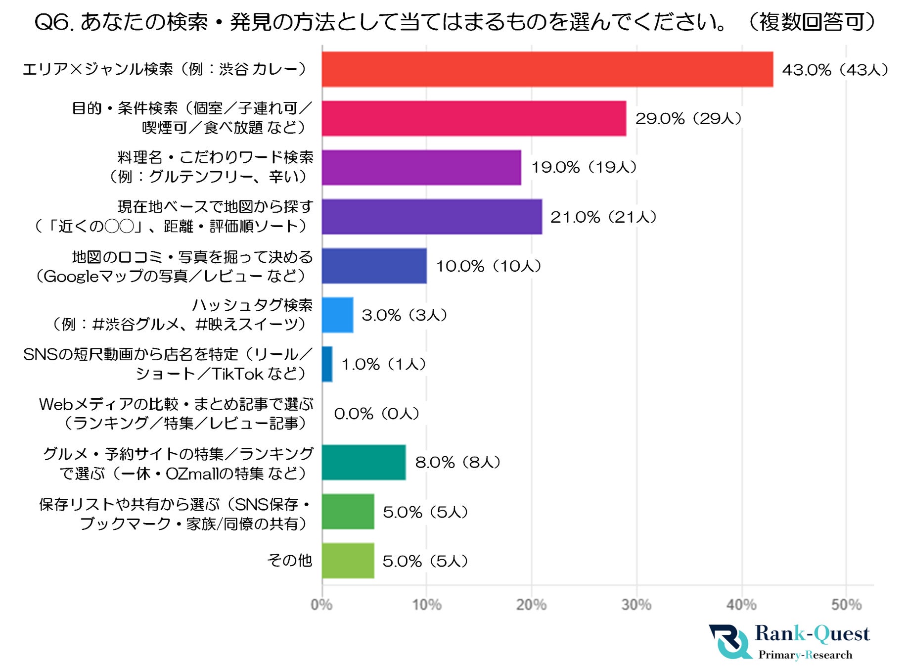最も多かったのは「エリア×ジャンル検索(例:渋谷 カレー)」で、43.0%(43人)でした。エリアと料理ジャンルを組み合わせた具体的な検索方法が最も一般的であり、目的の場所や食べたい料理を明確にして探す実用的なスタイルが主流となっています。