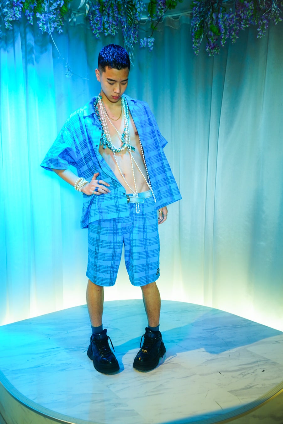 アイテムはオカモトレイジ氏が所有している、BAD BOYの前身である「LIFE'S A BEACH」の有刺鉄線柄のビンテージショーツを現代的にアレンジしたシャツ・ショーツを作成。本来は存在しないセットアップでの着用が可能なラインナップにて展開。そして今回のコレクション限定で作成されたYAGI EXHIBITION×BAD BOYのロゴをバックに落とし込んだTシャツの、計3型をポップアップにて販売。
