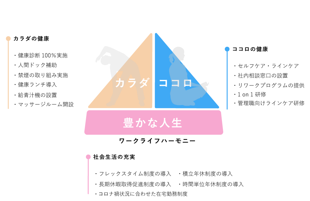フレックスタイムの導入、人間ドックの補助、社内外相談窓口開設など