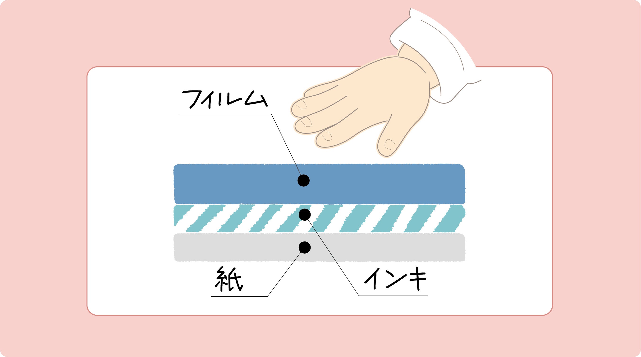 フィルムに付けたインキは、おしりふきで簡単に拭き取ることができるので、機嫌がころころ変わりじっとしていない子供を相手にしていてもすぐに片づけが終わる、忙しい親の味方です!