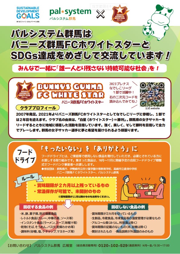 県内女子サッカーをけん引するバニーズ群馬FCホワイトスターは、地域のSDGs達成を目指してパルシステム群馬と交流しています。今回のフードドライブは、サッカーの魅力を通じてより多くの人たちへ食品提供を呼びかけるため合同開催が実現しました。家庭の食品ロス削減や生活困窮者支援など、SDGs実現に欠かせない課題に取り組みます。