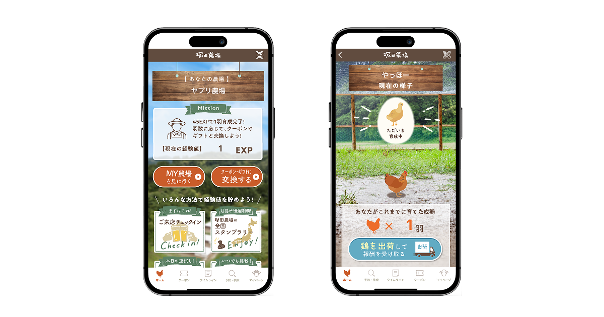 みやざき地頭鶏や黒さつま鶏など地鶏をメインとした居酒屋を展開する「塚田農場」のアプリ。Yappli CRMや多様な関連機能を活用したポイント制度、アプリ内で地鶏を育てる企画など豊富でユニークなアイデアが好評です。従来の”名刺制度”から”農場制度”へのリニューアルにはチーム一丸で継続的に取り組み、何度も通いたくなる顧客体験やアクティブ率の高さが特に注目されています。