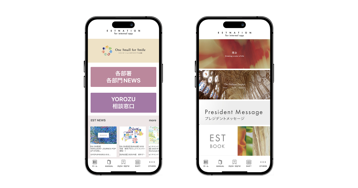アパレルブランド「ESTNATION」は顧客向けアプリだけでなく、店舗スタッフを含む全従業員をつなぐ情報共有アプリも運用しています。勤務シフトや商品情報、表彰記事といった本部発信に加え、各店舗から活動を発信することもできます。紙やPCに依存しない円滑な情報伝達により社内の情報浸透を促すとともに、従業員同士の学びやモチベーション向上にもつながっています。
