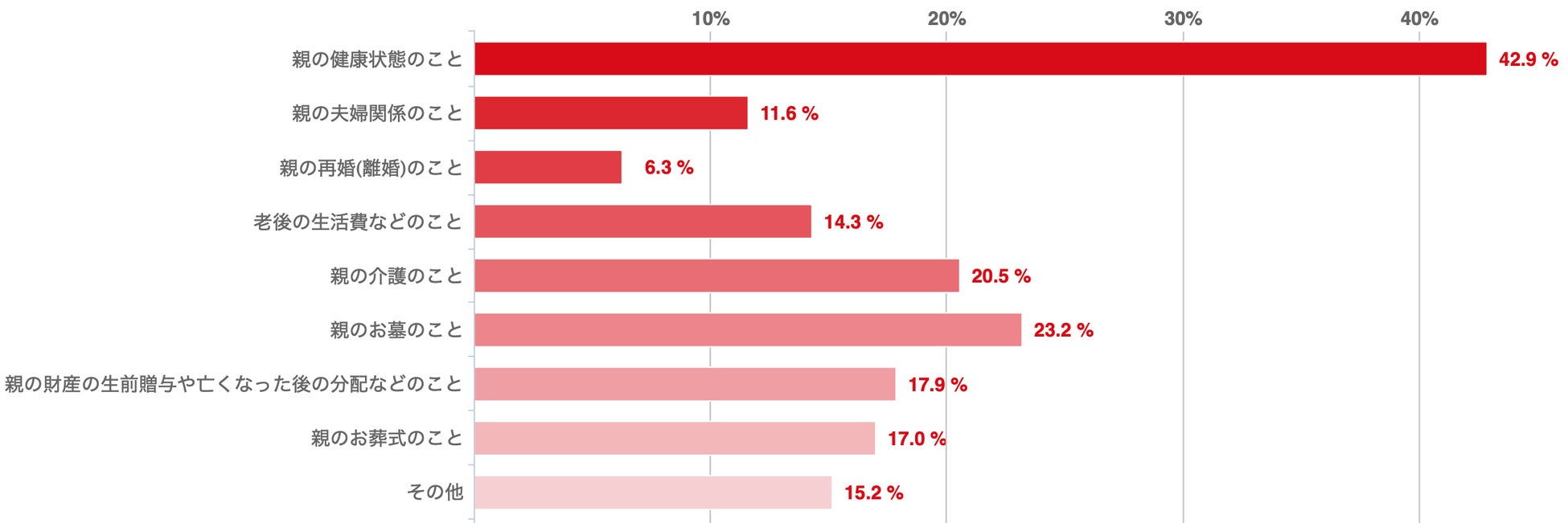 ◯親の健康状態のこと ◯親の夫婦関係のこと ◯親の再婚(離婚)のこと ◯老後の生活費などのこと ◯親の介護のこと ◯親のお墓のこと ◯親の財産の生前贈与や亡くなった後の分配などのこと ◯親のお葬式のこと ◯その他