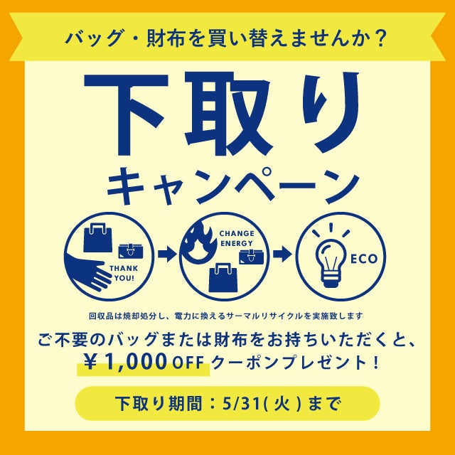 株式会社ヌーヴ・エイが運営する雑貨のセレクトショップ「COLLECTORS」では、2022年5月9日(月)~31日(火)の期間中、不要になったバッグ・財布をお持ちいただくと1点につき1000円分のクーポンに交換する下取りキャンペーンを開催します。