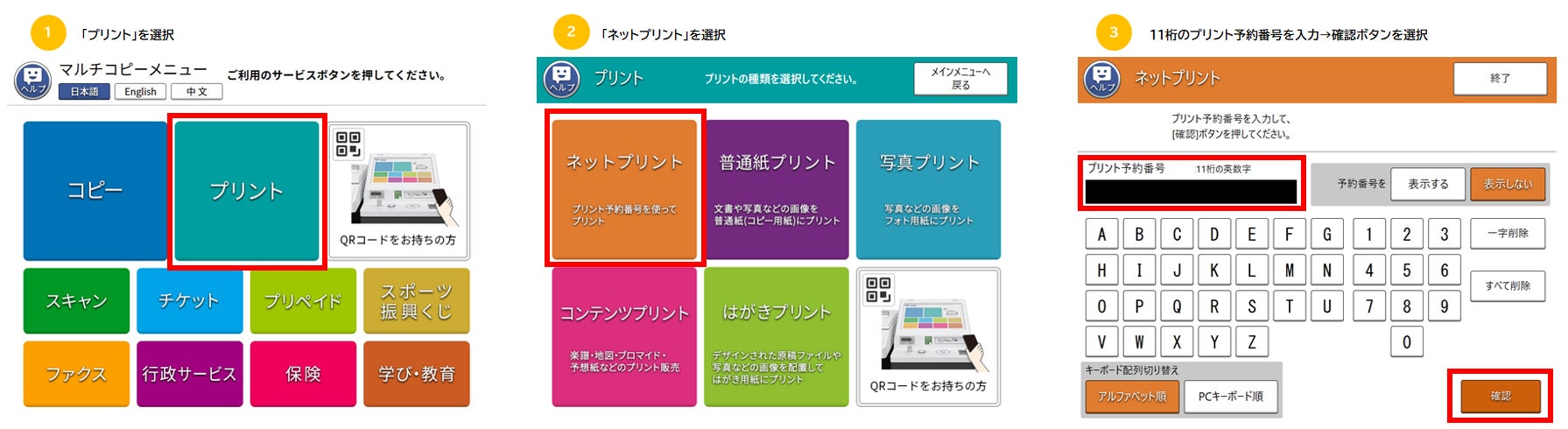⑤「プリント」→「ネットプリント」を選択し、プリント予約番号(11桁)を入力。