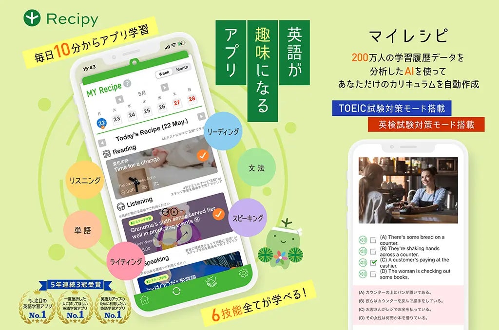 日本人の英語学習に特化している点、自分の興味のあるニュースで学習を続けられる点が評価され、今「レシピー」は250万人を越えるユーザー様にご利用頂いております。ここ数年では、AIによる学習カリキュラムの個別最適化機能「マイレシピ」、記事に音声や日本語訳、確認問題を自動的に付加できる「スマートスタディ」など新機能も充実し、さらなる進化を遂げています。