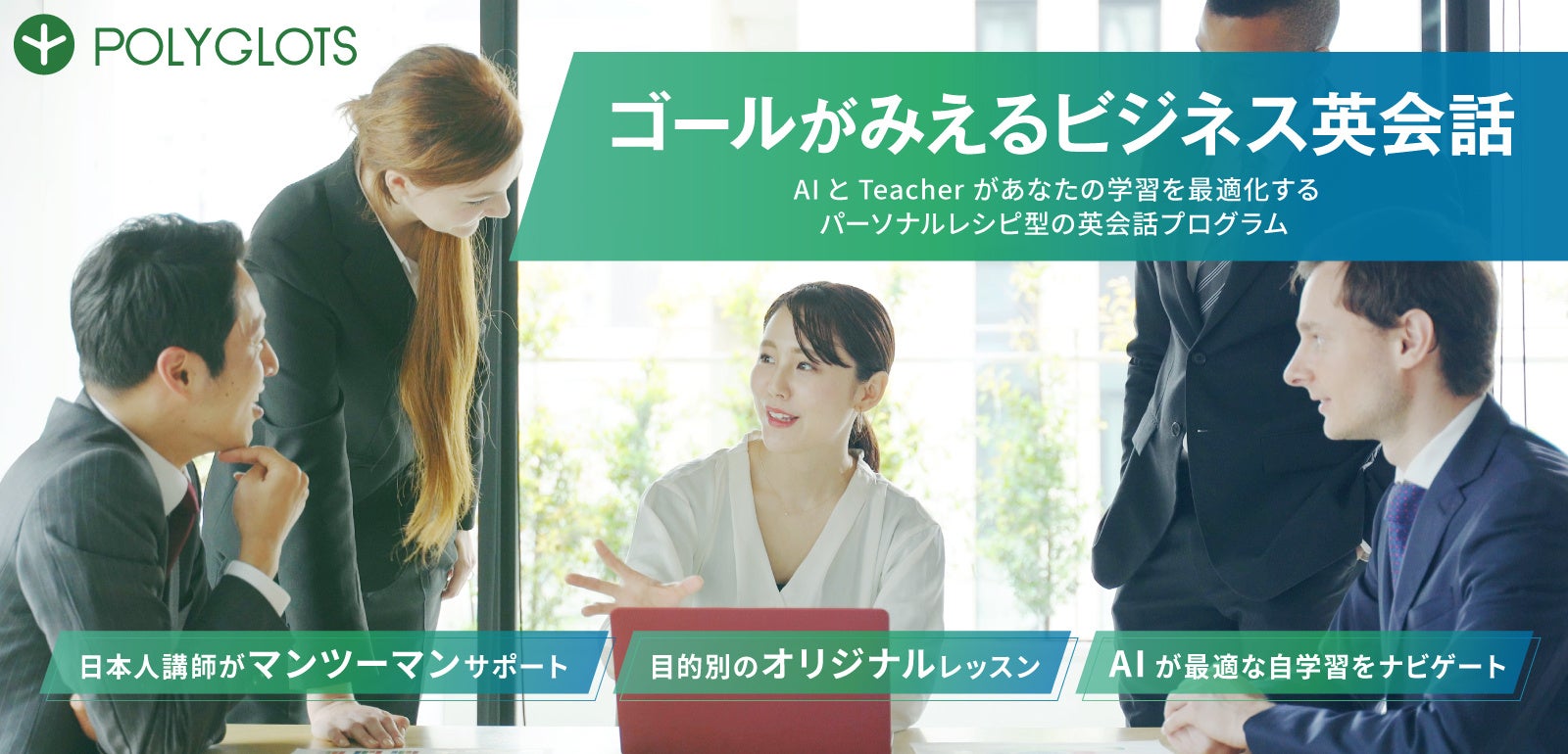 AI (アプリ) x 講師による個別最適化されたカリキュラムでビジネス英語が身につく英語研修サービスです。AI技術とバイリンガル講師によるサポートを融合した学習プログラムを通じて、多忙なビジネスパーソンにも効率的かつ効果的な学習体験をお届けすると同時に、あらゆるニーズに応えるべく、サービスの品質向上と新たな価値の創出に取り組んでいます。