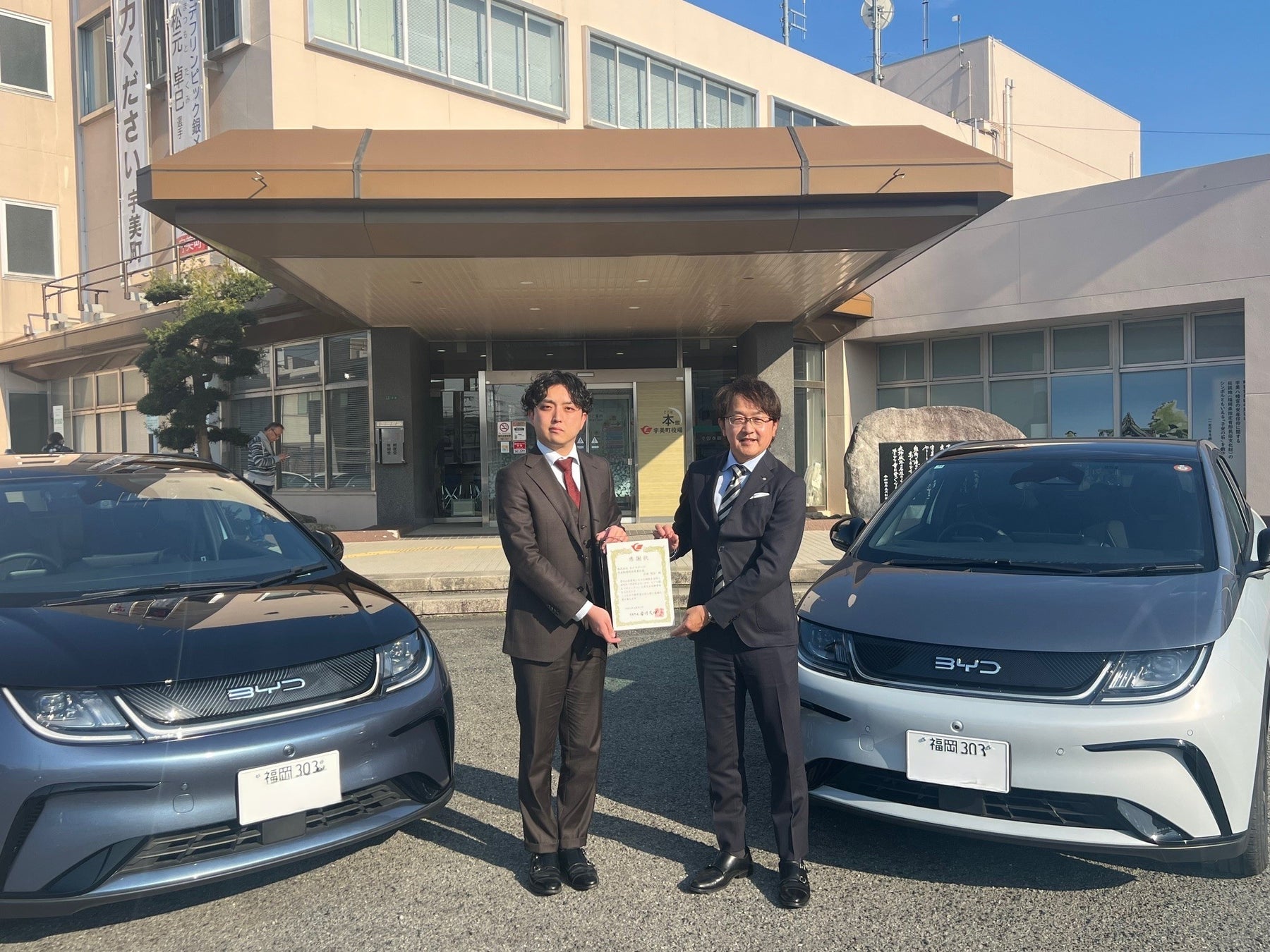 福岡県宇美町、企業版ふるさと納税を通じ電気自動車を導入し、「まち・ひと・しごと創生プロジェクト」を推進~ネクステージ「BYD DOLPHIN」を2台寄贈~