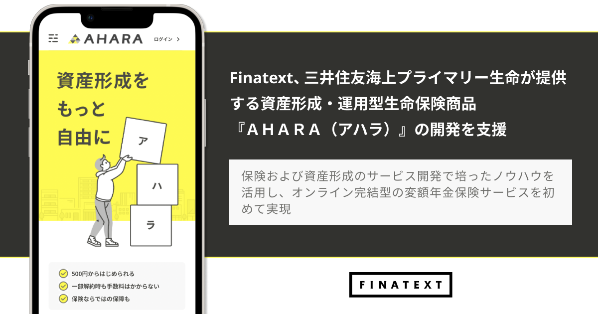 Finatext、三井住友海上プライマリー生命が提供する資産形成・運用型生命保険商品『AHARA(アハラ)』の開発を支援