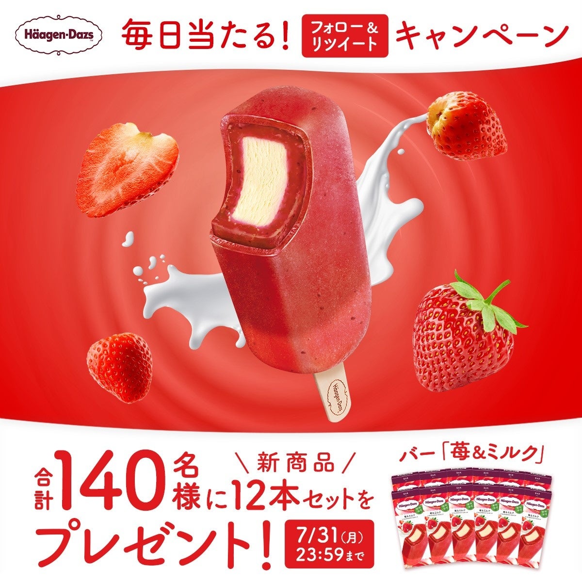 バー『苺&ミルク』の発売を記念して、毎日10名様(期間中合計140名様)に、バー『苺&ミルク』12本セットが当たるキャンペーンを、Twitterで実施します。