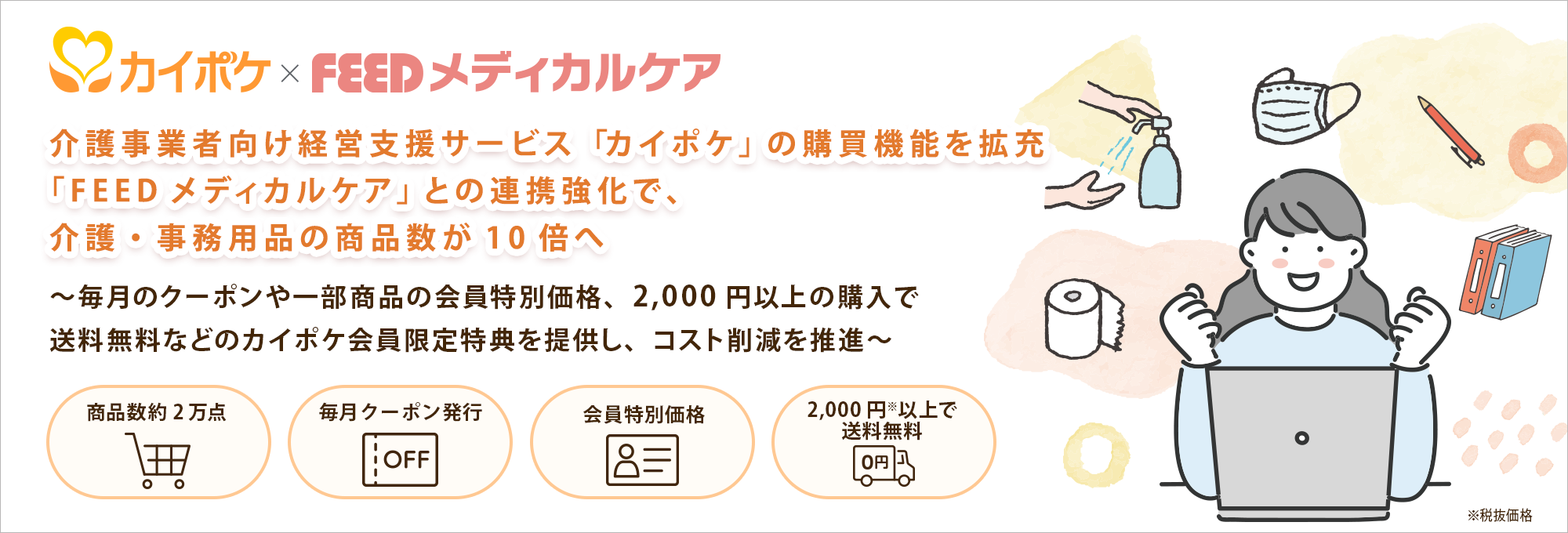 従来のカイポケは、フィードの運営する「FEEDメディカルケア」と連携し、当社が選定した介護・事務用品をリーズナブルな価格で提供する購買機能を有していました。この度、介護事業者の経営改善をさらに後押しするため、「FEEDメディカルケア」との連携を強化し、購買機能を拡充しました。カイポケ会員はカイポケから「FEEDメディカルケア」に登録・ログインすることで毎月発行される会員専用クーポンの取得や、介護・事務用品の一部商品を会員特別価格でより安価に購入できるほか、税抜価格2,000円以上の購入で送料が無料になるなどの優遇を受けられます。さらに購入可能な商品点数も従来の約10倍となり、幅広い選択肢から最適な商品を選ぶことができるようになりました。特に要望の多かったティッシュやペーパータオル、文具といった日用品の取り扱い数が増加し、また、介護の必須アイテムである感染対策商品の取り扱い点数が約6倍になりました。