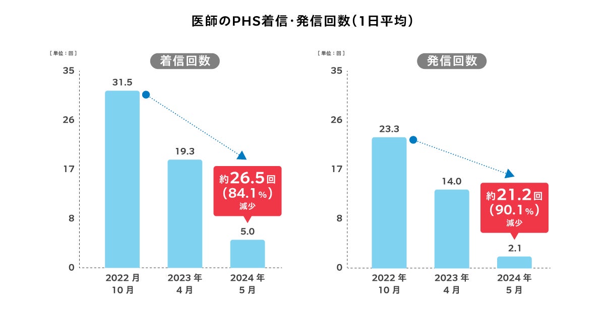 これにより、医師一人当たりのPHS平均着信回数は31.5回/日から5回/日となり約84%減少(26.5回/日)しました。PHS平均発信回数は23.3回/日から2.1回/日となり約90%減少(-21.2回/日)するなど医師の負担軽減の効果がみられました。(回復期病棟を担当する医師4名の2022年10月と2024年5月の1日当たり平均比較)