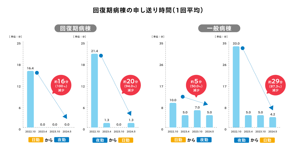 さらに、夜勤看護師から日勤看護師への交代時の申し送りを紙・口頭からチャットに変更したことで、1回あたり平均16.4分かかっていたところ申し送り時間ゼロを実現。また、日勤看護師から夜勤看護師への申し送りにおいても、大幅な短縮効果が出ています。(一般病棟における2022年10月と2024年4月の1回当たり平均比較)