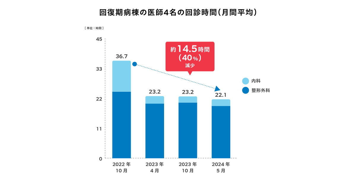 また、医師による入院患者への回診は、約36.7時間/月かかっていたところ、回診に必要な情報を事前にチャットで連絡することで、2024年5月には約22.1時間/月となり、約40%減少(-14.5時間/月)したことがわかりました。(回復期病棟を担当する医師4名の2022年10月と2024年5月の回診時間月間総合計比較)