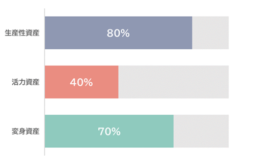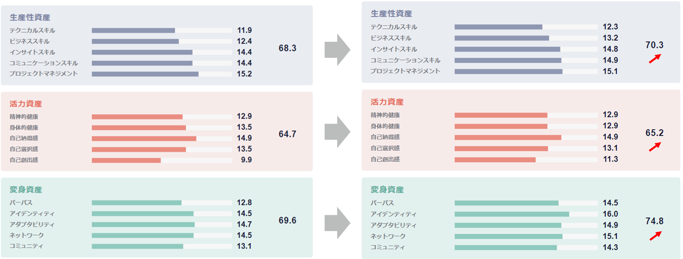 実証前と比較して10/15項目でポイントが上昇。生産性資産と変身資産が向上した人の割合が多く、特に変身資産はすべての項目で向上実感が高い傾向に。ワーケーションは単なるリフレッシュの機会ではなく、社員の成長や変化への適応に資することが明らかになりました。