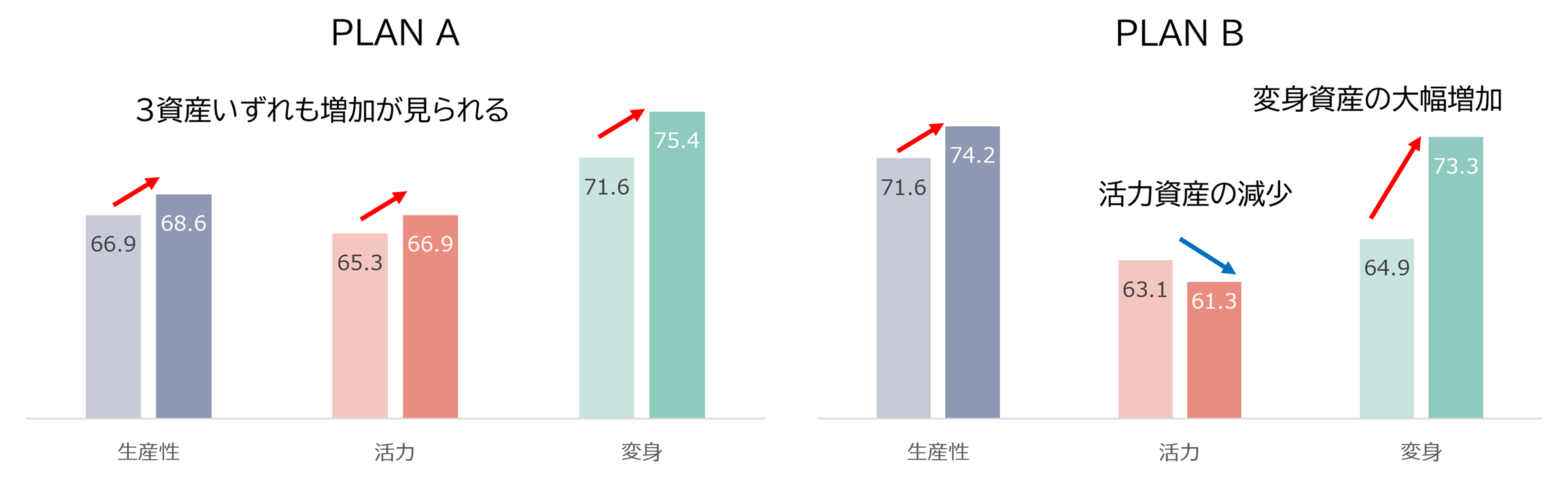 【PLAN A】では生産性・活力・変身資産いずれも増加がみられた一方、【PLAN B】では変身資産は大幅な増加がみられたが活力資産は減少する結果に。ワーケーションに越境体験の要素を加えることで、環境変化の刺激が資産変化ではポジティブ/ネガティブそれぞれに発揮されることが判明しました。