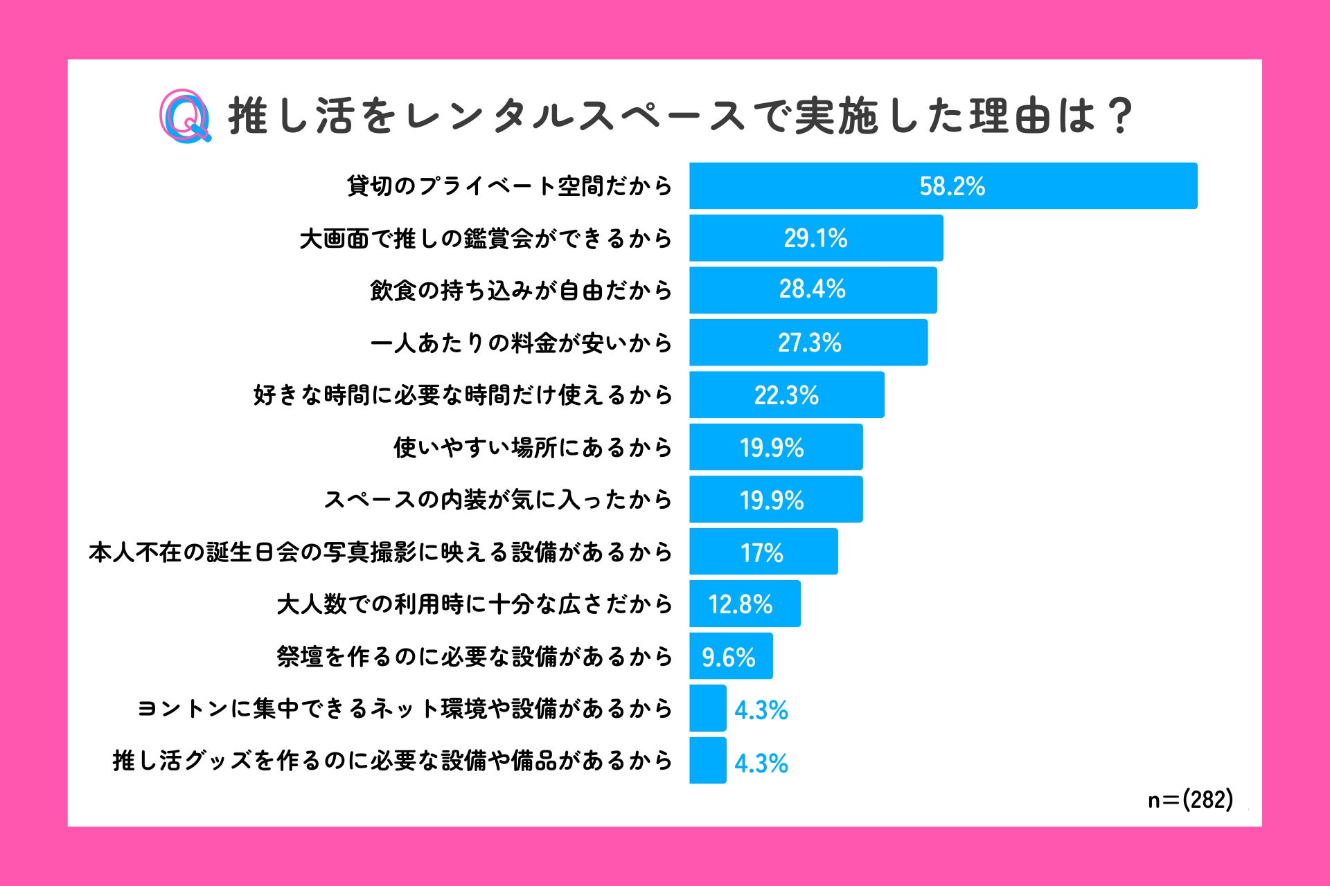 スペースマーケットのゲスト(スペースを借りる側)で、レンタルスペースで推し活をしたことがある人のうち、58.2%が推し活をレンタルスペースで実施した理由に「貸切のプライベート空間だから」と回答。続いて、「大画面で推しの鑑賞会ができるから」(29.1%)、「飲食の持ち込みが自由だから」(28.4%)という結果となりました。周りの目を気にせずに、プロジェクターなど使用した大画面での鑑賞会や、推しケーキをはじめとした飲食の持ち込みなど自由度の高さを重視していることがわかりました。