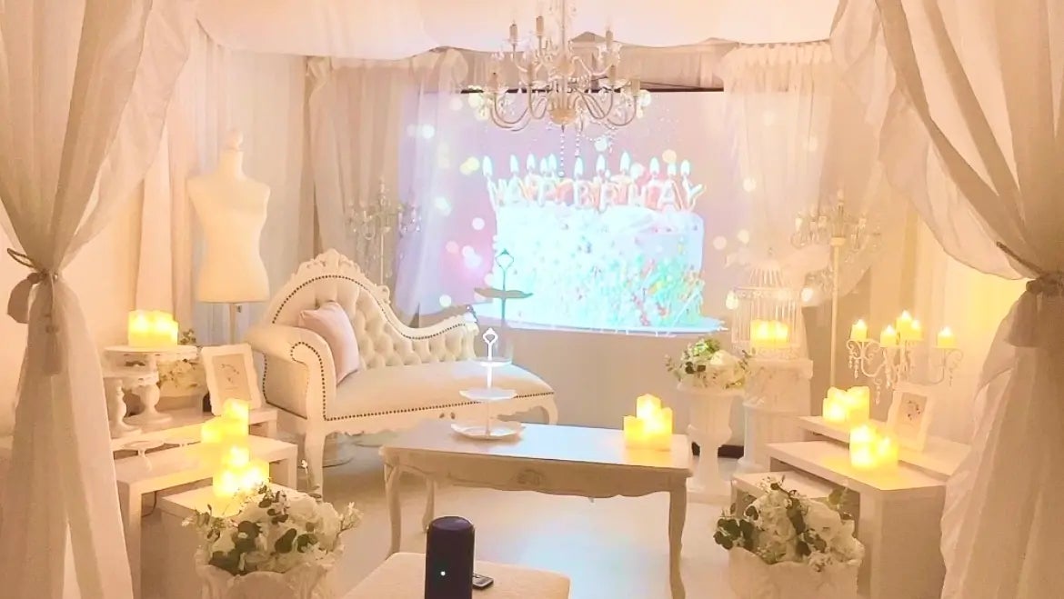 本アンケート結果のレンタルスペース推し活を選ぶ理由として上位にあがった「大画面で推しの鑑賞会ができる」スペースをピックアップ。推しカラーが映える「カラーレス」なスペースが人気です。大画面のライブ映像鑑賞のみならず、本人不在の誕生日会や、推しグッズを置いて楽しめる祭壇が作れるのもポイントです。