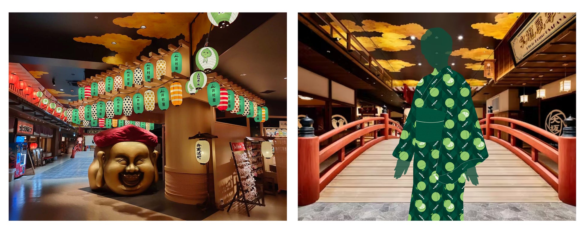 2025年4月25日(金)から5月26日(月)の期間中、空庭温泉の施設内にて『メロンボール』を喫食体験できるサンプリングキャンペーンを実施します。空庭温泉内2Fの弁天通りに設置されている提灯や脱衣所の暖簾などの装飾が、『メロンボール』仕様に特別にデザインされるほか、館内着の浴衣も数量限定で『メロンボール』柄が登場。