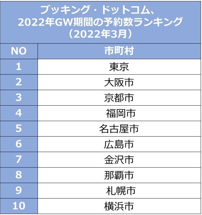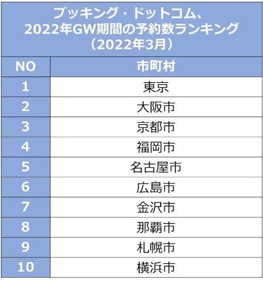 日本にいる人々が2022年のゴールデンウィークを予約対象期間として3月中に予約した日本国内の宿泊先で、最も予約数が多いのは東京です。大都市以外にも上位10地域のうち、広島、金沢、札幌など地方都市もランクインしており、ゆったりとした時間を過ごすことができる旅先も人気であることが伺えます。気温も暖かくなり、心地よく過ごせる日々が続く中で、ゴールデンウィークに、少し遠くに出かけ普段とは異なる景色を眺めたり、食事を楽しんだり、新しい経験に挑戦してみてはいかがでしょうか。
