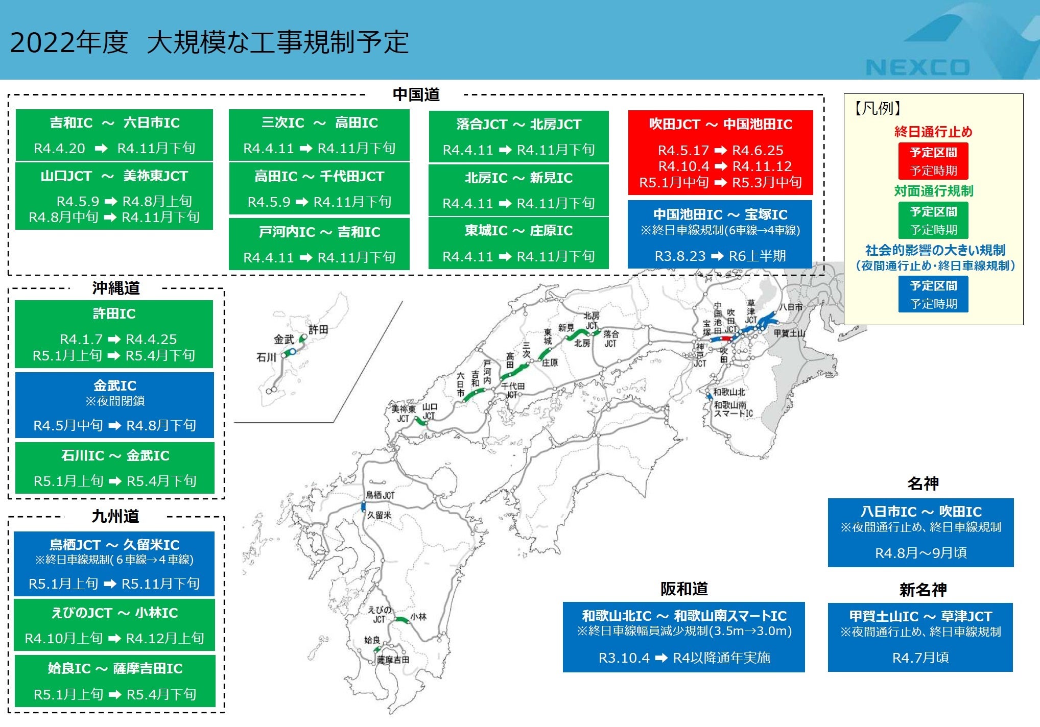 NEXCO西日本(大阪市北区、代表取締役社長:前川 秀和)は、2022年度において予定している大規模かつ長期間にわたる交通規制を伴う工事規制予定について、お知らせします。
