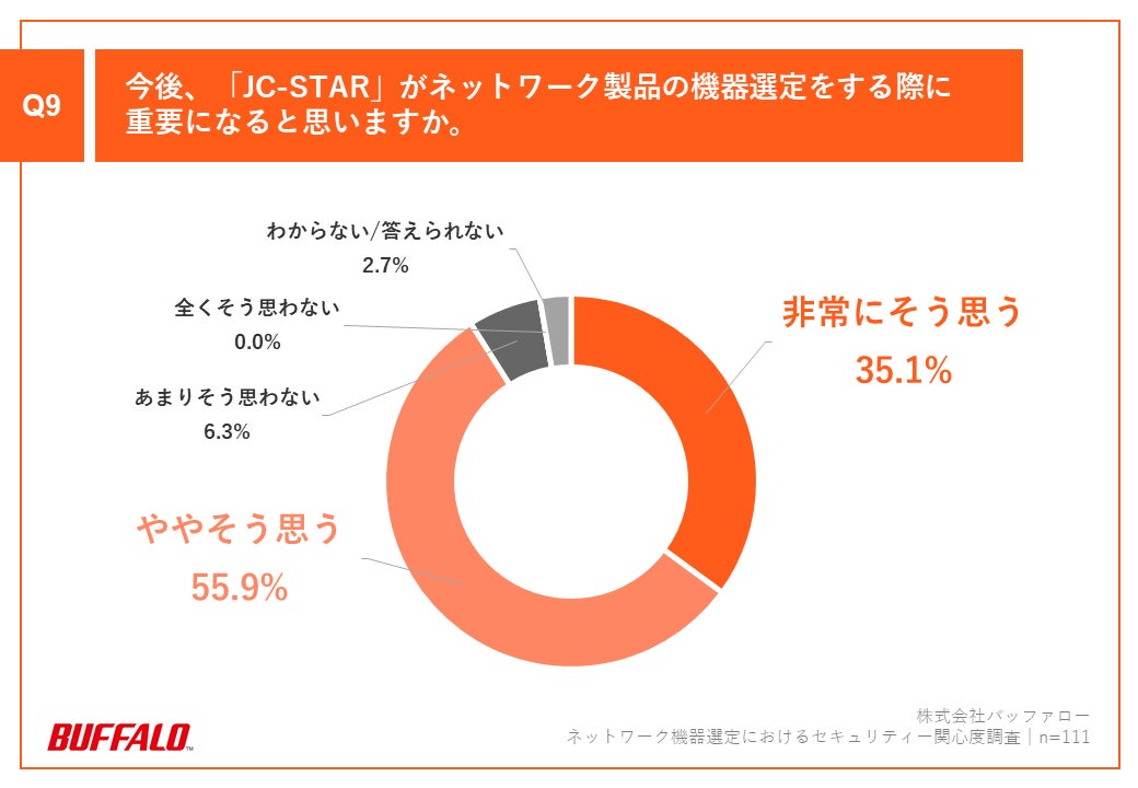 「Q9.今後、「JC-STAR」がネットワーク製品の機器選定をする際に重要になると思いますか。」(n=111)と質問したところ、「非常にそう思う」が35.1%、「ややそう思う」が55.9%という回答となりました。