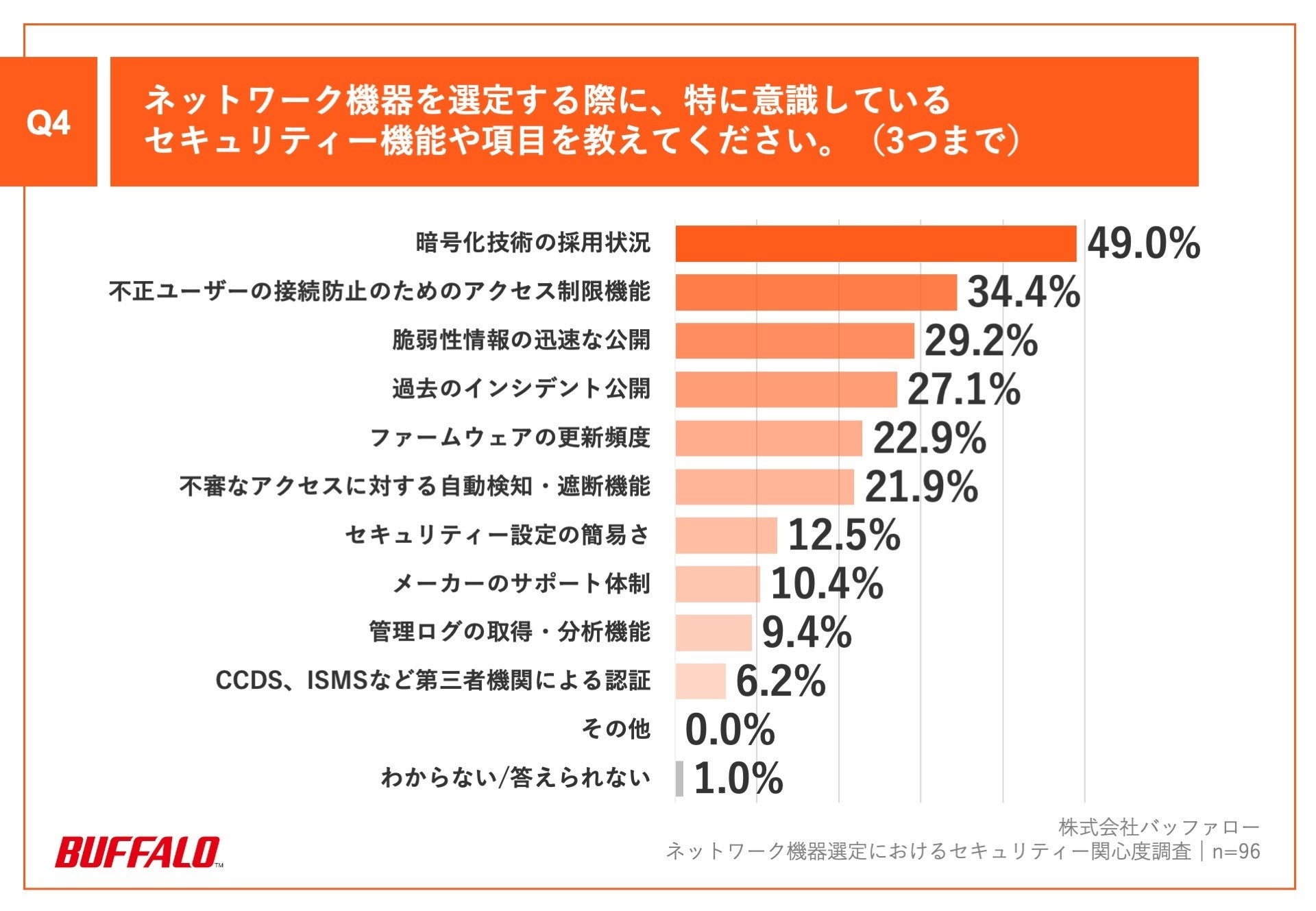 「Q4.ネットワーク機器を選定する際に、特に意識しているセキュリティー機能や項目を教えてください。(3つまで)」(n=96)と質問したところ、「暗号化技術の採用状況」が49.0%、「不正ユーザーの接続防止のためのアクセス制限機能」が34.4%、「脆弱性情報の迅速な公開」が29.2%という回答となりました。