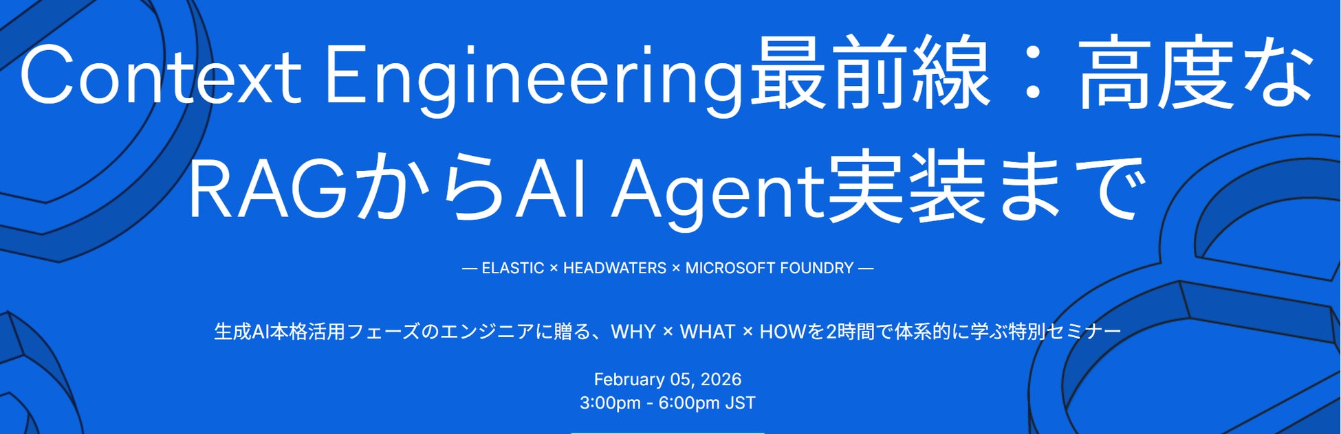 本セミナーでは、生成AI活用を過去推進してきたAIエンジニアを対象に、Elastic、日本マイクロソフト、ヘッドウォータースの3社が共同で、Context Engineeringの本質と高度なRAGを活用した最新実装手法を体系的に解説します。Why → What → How の三段階で、現場の技術者が即日活かせる知見を提供します。セッション後には、参加者同士で知見交換できる1時間のネットワーキングも設けています。