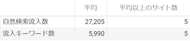 以下は、Ahrefsを使用し、セールステック(SFA)業界20サイトの自然検索流入数および流入キーワード数を調査した結果です。自然検索流入の平均値は月間27,205ですが、平均を上回るサイトは5件にとどまりました。また、流入キーワード数は5,990で、平均を上回るサイトは5件という結果になりました。また、流入上位3サイトの自然検索流入は平均値と比較してとても高い事がわかります。